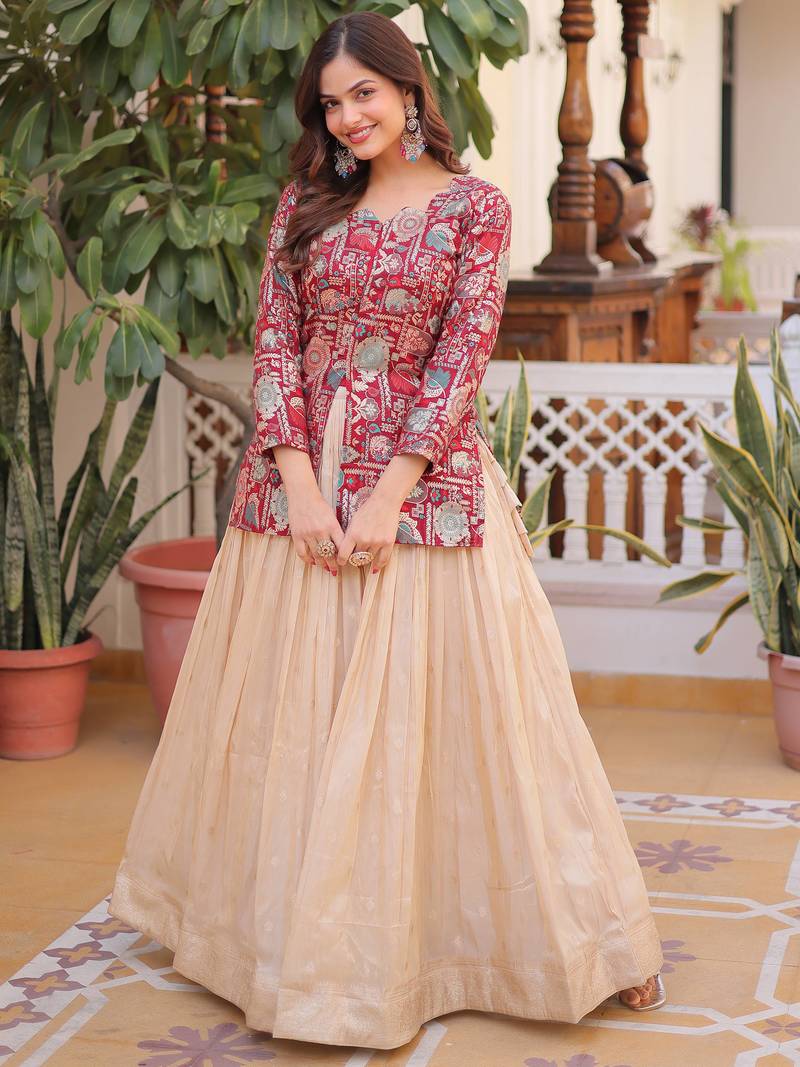 Great Maroon Zari Weaving Festival Wear Lehenga With Peplum Top