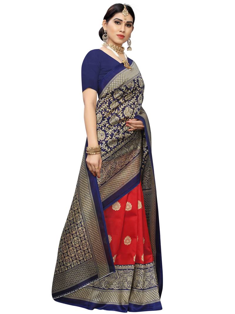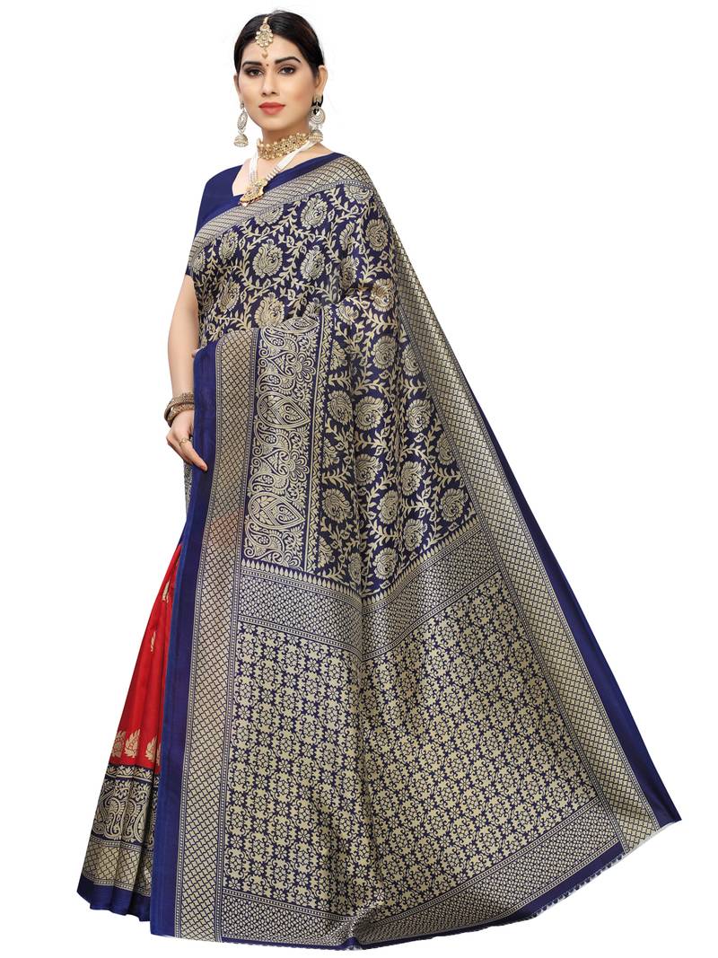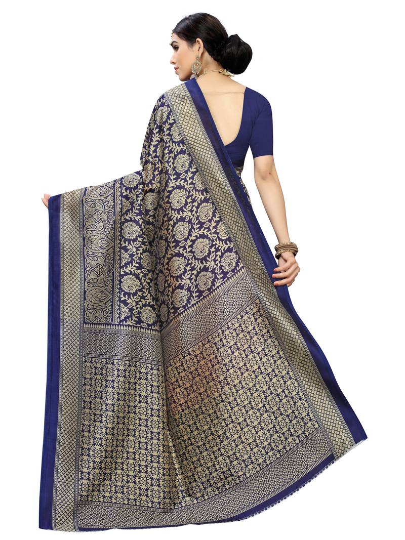 Fabric:: Saree: Poly Silk, Blouse: Poly Silk || Size:: Saree: 5.20Mtr, Blouse: 0.80Mtr || Work:: Saree: Printed, Blouse: Dyed, Plain || Color:: Saree: Navy Blue, Blouse: Navy Blue |