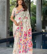 This beautiful Jamdani Saree is off-white in color and is made up of cotton. Its body is covered with gorgeous off-white Jamdani prints while its borders and pallu feature floral embroidery that is pink, blue, orange and purple in color. Further, the pallu also has orange lining and stylish tassels hanging off it. It also comes with an unstitched blouse piece that is lined with orange color. This cotton saree is absolutely stunning and will make a thoughtful gift to someone special.