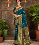 Teal Paithani Silk Blend Handwoven Saree With Designer Pallu And Unstitched Blouse