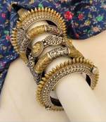 Let this gold and silver kada set make a bold statement wherever you go; enriched with a dual-tone resplendence, the antique brass bangle set contains five superbly engraved kadas that open up and are artistically detailed in strict adherence to heritage craftsmanship. A gold and silver tone mix adds regal charm to this ornament, making it versatile with any collection of jewelry. The simple-to-wear nature of the open mechanism makes this gold and silver kada set perfect for festive occasions, weddings, or just to give that vintage touch to a normal-day look.
