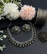 Oxidized Dual Tone Jewelry Set Of Choker Necklace , Earrings, Ring & Cuff Bangle For Wedding Wear