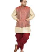 Men's Gold, Maroon And White Silk Blend Jacket Kurta Dhoti Set