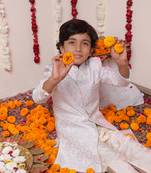 Fabric: Viscose Blend | Contents: A Elevate your little one's style with our jacquard sherwani kurta pyjama Set for boys. Elevate your little one's style with our jacquard sherwani kurta pyjama Set for boys. Suitable for: Party, Weddings, Regular Wear, Celebrations, Occasions, Festivals, Lohri, Pongal, Makar Sakranti, Baisakhi, Holi, Eid, Raksha Bandhan, Dussehra, Diwali, Navratri, Pooja, Christmas, Onam, Ganesh Chaturthi, Janmasthmi and Gifts for Boys Get your little boy these kurta pajama for boys and jacket for boys stylish stitched meticulously to fit all body type. This ethnic wear for kids boys fabric has been designed keeping in mind the latest trends in a casual fashion or occassional fashion. Engineering garments which fit all body types and style is our aim. These pyjama kurta for boys party wear or regular wear are made with superior quality very soft fabric and comfortable wear. These are multi utility sets, the Nehru Jackets for boys latest Modi Jackets for kids can be used separately as a bandi or for a formal event, or a school cultural fancy dress program. These jackets are best safer alternatives to winter coats or blazers, as it covers the chest area of the child. These are perfect light weight easy to wear alternative to a servani or sherwani for kids boy. Our recommendation next time don't go for a kids sherwani for boy stylish latest design or indo-western for kids, try these! Paired it with a nice shirt on a jeans to flaunt a charming killer daper boy! To complete the look adorn a mojari or jutti slippers for kids stylish, you may also try an authentic Kohlapuri chappal for boys, the fashionistas and millennial folks may experiment with a brogues or oxfords juta for boys stylish. Suitable for: Party, Weddings, Regular Wear, Celebrations, Occasions, Festivals, Lohri, Pongal, Makar Sakranti, Baisakhi, Saraswati Puja, Holi, Ugadi, Jamai Sasthi, Eid, Raksha Bandhan, Dussehra, Diwali, Navratri, Pooja, Christmas, Onam, Ganesh Chaturthi, Janmasthmi and Gifts for Kids. We manufacture kids wear for boys 1-2 years, 2-3 years, 3-4 years, 4-5 years, 5-6 years, 6-7 years, 7-8 years, 8-9 years, 9-10 years, 10-11 years, 11-12 years, 12-13 years, 13-14 years, 14-15 years and kids wear for baby boys 0-6 months, 6-12 months, 12-18 months, 18-24 months. Wash Care Instructions: Dry Clean preferably or cold light wash.Disclaimer: We have made a consistent effort to make the colors and finishes similar to the image of the products you see on screen. However, the actual product and the images on the website can differ! Customer's discretion is advised.