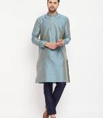 Men's Aqua And Navy Blue Silk Blend Kurta Pyjama Set