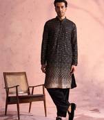 Fabric: Georgette | Contents: a All over sequinced in ombre design kurta and patiala setAll over sequinced in ombre design kurta and patiala setMedium length and Regular Fit. Our Kurta fitting is usually slightly relaxed compared to a Regular Shirt's fitting. Select your Kurta size based on your chest dimension. Note: if one has a heavier abdomen compared to chest then he should select one size bigger kurta.All our kurtas have five inches loosening over the body measurement. So if your chest round measurement is 38 inches then you should go for a 38 (Medium) size Kurta which will have a garment ready chest measurement of 43 inches. We offer six sizes - Small = 36 (Chest - 41), Medium = 38 (Chest - 43), Large = 40 (Chest - 45), X- Large = 42 (Chest - 47), XX - Large = 44 (Chest - 49) and XXX - Large = 46 (Chest - 51). Wash Care Instructions: Dry Clean preferably or cold light wash.Disclaimer: We have made a consistent effort to make the colors and finishes similar to the image of the products you see on screen. However, the actual product and the images on the website can differ! Customer's discretion is advised. Suitable for: Party, Weddings, Regular Wear, Celebrations, Occasions, Festivals, Lohri, Pongal, Makar Sakranti, Baisakhi, Holi, Eid, Raksha Bandhan, Dussehra, Diwali, Navratri, Pooja, Christmas, Onam, Ganesh Chaturthi, Janmasthmi and Gifts for Mens.