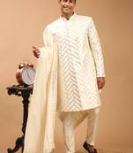 Men's Cream Silk Blend Sherwani Set With Dupatta