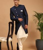 Fabric: Viscose | Contents: a A Set Of Angrakha Style Indo Western Over Cream Kurta Pyjama Set In Fluid Viscose Fabric Making It The Perfect Accompaniment For Any Season And OccasionA Set Of Angrakha Style Indo Western Over Cream Kurta Pyjama Set In Fluid Viscose Fabric Making It The Perfect Accompaniment For Any Season And OccasionVastramay introduces to you these classy sherwani for men stylish latest design in variety of material and designs for all occassions. This men's ethnic wear fabric has been designed keeping in mind the latest trends in a semi formal fashion or occassional fashion. Engineering garments which fit all body types and style is our aim. We offer not just servani for man for wedding but also indo western for men and semi sherwani as well covering the entire space. Our servani are constructed in such a way that you can adorn it with a churidar, dhoti for men or a patiala too. To complete the look adorn a mojari or jutti slippers for men stylish, you may also try an authentic Kohlapuri chappal for men, the fashionistas and millennial folks may experiment with a brogues or oxfords juta for men stylish. Suitable for: Party, Weddings, Sangeet, Mehandi, Regular Wear, Celebrations, Occasions, Festivals, Lohri, Pongal, Makar Sakranti, Baisakhi, Saraswati Puja, Holi, Ugadi, Jamai Sasthi, Eid, Raksha Bandhan, Dussehra, Diwali, Navratri, Pooja, Christmas, Onam, Ganesh Chaturthi, Janmasthmi and Gifts for Men.Suitable for: Party, Weddings, Regular Wear, Celebrations, Occasions, Festivals, Lohri, Pongal, Makar Sakranti, Baisakhi, Holi, Eid, Raksha Bandhan, Dussehra, Diwali, Navratri, Pooja, Christmas, Onam, Ganesh Chaturthi, Janmasthmi and Gifts for Mens.Wash Care Instructions: Dry Clean preferably or cold light wash.Disclaimer: We have made a consistent effort to make the colors and finishes similar to the image of the products you see on screen. However, the actual product and the images on the website can differ! Customer's discretion is advised. All our Sherwanis have four inches loosening over the body measurement. So if your chest round measurement is 38 inches then you should go for a 38 (Medium) size Kurta which will have a garment ready chest measurement of 42 inches. We offer six sizes - Small = 36 (Chest - 40), Medium = 38 (Chest - 42), Large = 40 (Chest - 44), X- Large = 42 (Chest - 46), XX - Large = 44 (Chest - 48) and XXX - Large = 46 (Chest - 50).