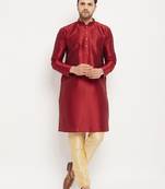 Men's Maroon And Gold Silk Blend Kurta Pyjama Set