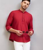 Fabric: Cotton Blend | Contents: a Cotton Short Shirt Style Solid Kurta With Buttonhole Detailing.Cotton Short Shirt Style Solid Kurta With Buttonhole Detailing.Medium length and Regular Fit. Our Kurta fitting is usually slightly relaxed compared to a Regular Shirt's fitting. Select your Kurta size based on your chest dimension. Note: if one has a heavier abdomen compared to chest then he should select one size bigger kurta. Our Churidar Pajamas have drawstrings and a separate pocket attached to it. The pyjama bottom mohri is usually kept narror to bring out the best possible churi look. Although popularly known as Kurta Pyjama but this ethnic wear for men can be suitably used as pathani suit for men stylish, jubba for men, panjabi for men or khan dress for men stylish. Most material used for kurta under 300 tensil count only. These are good alternative to a Indo western or a servani. Check out for kurta for mens new looks, kurta for mens wedding, punjabi kurta for men.All our kurtas have five inches loosening over the body measurement. So if your chest round measurement is 38 inches then you should go for a 38 (Medium) size Kurta which will have a garment ready chest measurement of 43 inches. We offer six sizes - Small = 36 (Chest - 41), Medium = 38 (Chest - 43), Large = 40 (Chest - 45), X- Large = 42 (Chest - 47), XX - Large = 44 (Chest - 49) and XXX - Large = 46 (Chest - 51). Suitable for: Party, Weddings, Regular Wear, Celebrations, Occasions, Festivals, Lohri, Pongal, Makar Sakranti, Baisakhi, Holi, Eid, Raksha Bandhan, Dussehra, Diwali, Navratri, Pooja, Christmas, Onam, Ganesh Chaturthi, Janmasthmi and Gifts for Mens.Wash Care Instructions: Dry Clean preferably or cold light wash