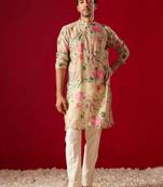 Men's Multi Color Base Beige Cotton Blend Kurta Pyjama Set