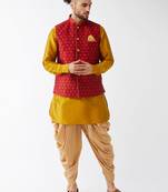Men's Mustard, Maroon And Rose Gold Silk Blend Jacket, Kurta And Dhoti Set