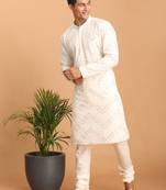 Fabric: Georgette | Contents: a Mirror work White Georgette Kurta and Pyjama Set.Mirror work White Georgette Kurta and Pyjama Set.Medium length and Regular Fit. Our Kurta fitting is usually slightly relaxed compared to a Regular Shirt's fitting. Select your Kurta size based on your chest dimension. Note: if one has a heavier abdomen compared to chest then he should select one size bigger kurta. Our Churidar Pajamas have drawstrings and a separate pocket attached to it. The pyjama bottom mohri is usually kept narror to bring out the best possible churi look. Although popularly known as Kurta Pyjama but this ethnic wear for men can be suitably used as pathani suit for men stylish, jubba for men, panjabi for men or khan dress for men stylish. Most material used for kurta under 300 tensil count only. These are good alternative to a Indo western or a sherwani. Check out for kurta for mens new looks, kurta for mens wedding, punjabi kurta for men.All our kurtas have five inches loosening over the body measurement. So if your chest round measurement is 38 inches then you should go for a 38 (Medium) size Kurta which will have a garment ready chest measurement of 43 inches. We offer six sizes - Small = 36 (Chest - 41), Medium = 38 (Chest - 43), Large = 40 (Chest - 45), X- Large = 42 (Chest - 47), XX - Large = 44 (Chest - 49) and XXX - Large = 46 (Chest - 51). Suitable for: Party, Weddings, Regular Wear, Celebrations, Occasions, Festivals, Lohri, Pongal, Makar Sakranti, Baisakhi, Holi, Eid, Raksha Bandhan, Dussehra, Diwali, Navratri, Pooja, Christmas, Onam, Ganesh Chaturthi, Janmasthmi and Gifts for Mens.Wash Care Instructions: Dry Clean preferably or cold light wash.Disclaimer: We have made a consistent effort to make the colors and finishes similar to the image of the products you see on screen. However, the actual product and the images on the website can differ! Customer's discretion is advised.