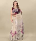 Design, Fabric and Color: This stylish saree is white in color and is made out of organza. The saree is transparent and features purple and green floral prints on its body. It also comes with a matching purple blouse that is sleeveless and has a square neckline.