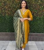 • Product Id : 4564672 • Package Details : 1 Top, 1 Bottom, 1 Dupatta • Type : Kurta Sets • Fabric : Art Silk • Type : Thread Work • Sleeve : Elbow Sleeve • Neck Style : V Neck • Color : Yellow • Work : Hand Embroidery • Stitching : Stitched • Length : 45.0 Payments [+]