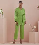 Green Co Ord Set Front Open Tunic With Pants In Green Cotton