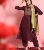 • Product Id : 4267485 • Package Details : 1 Top / 1 Bottom / 1 Dupatta • Type : Kurta Sets • Region : Other • Occasion : Wedding • Fabric : Cotton Silk • Work : Embroidered • Type : Dori Embroidery • Look : Traditional • Sleeve : Quarter Sleeve • Neck Style : Round Neck • Color : Purple • Stitching : Stitched • Length : 44.0 Payments [+]