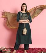 • Product Id : 4267486 • Package Details : 1 Top / 1 Bottom / 1 Dupatta • Type : Kurta Sets • Region : Other • Occasion : Festive • Fabric : Cotton Silk • Work : Embroidered • Type : Dori Embroidery • Look : Designer • Sleeve : Quarter Sleeve • Neck Style : Round Neck • Color : Green • Stitching : Stitched • Length : 44.0 Payments [+]