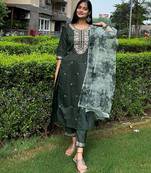 • Product Id : 4479651 • Package Details : 1 Kurta : : 1 Pant : : 1 Dupatta • Type : Kurta Sets • Region : Other • Occasion : Wedding • Fabric : Cotton Silk • Work : Embroidered • Type : Resham Embroidery • Look : Traditional • Sleeve : Quarter Sleeve • Neck Style : Round Neck • Color : Green • Stitching : Stitched • Length : 44.0 Payments [+]