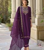 • Product Id : 4424855 • Package Details : 1 Kurta : : 1 Pant : : 1 Dupatta • Type : Kurta Sets • Region : Other • Occasion : Festive • Fabric : Viscose Rayon • Work : Embroidered • Type : Resham Embroidery • Look : Traditional • Sleeve : Quarter Sleeve • Neck Style : Round Neck • Color : Purple • Stitching : Stitched • Length : 44.0 Payments [+]