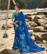 Royal Blue Sufiya Georegtte Floral All Over Printed & Lace Border Saree With Banglori Blouse