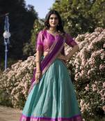 Embrace tradition with this elegant purple and blue lehenga set. Crafted from rich Kanchipuram silk, it offers a graceful drape and a soft, lustrous finish. The blue lehenga stands out with intricate gold zari woven motifs and a wide purple border featuring detailed floral and geometric patterns. The matching purple choli and dupatta carry the same gold zari work, tying the look together. The choli is semi-stitched and can be tailored with a wide neckline and short sleeves. A purple dupatta completes the ensemble with its ornate border and delicate detailing. Ideal for weddings, festive occasions, or traditional gatherings, this semi-stitched lehenga brings timeless charm and regal elegance once tailored.
