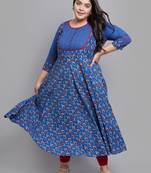Women's Plus Size Cotton Floral Printed Pintucks Anarkali Kurti (Blue)