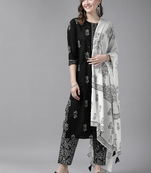 Yufta Women's Black printed Kurta with Trousers and dupatta Kurta design:Ethnic motifs printed Straight shape Regular style Round neck, three-quarter regular sleeves Sequinned detail Calf length with straight hem Pure cotton machine weave fabric Trousers design: Printed Trousers Elasticated waistband Slip-on closure 1 pocket Dupatta design: Printed with printed border Material & Care Kurta fabric: 100% Cotton Bottom fabric:100% Cotton Dupatta fabric:100% Cotton Hand-Wash