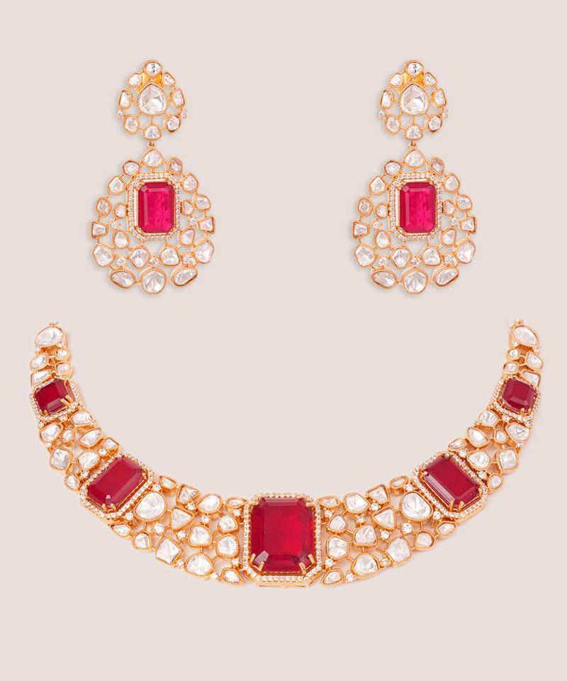 This Gold Plated Kundan Red Stone Choker Necklace Set Exudes Regal Elegance And Timeless Charm. Adorned With Beautifully Set Green Stones, It Showcases Intricate Craftsmanship And A Radiant Finish. Perfect For Weddings, Festive Occasions, Or Special Celebrations, It Adds A Rich Pop Of Color And Sophisticated Allure To Any Traditional Ensemble.